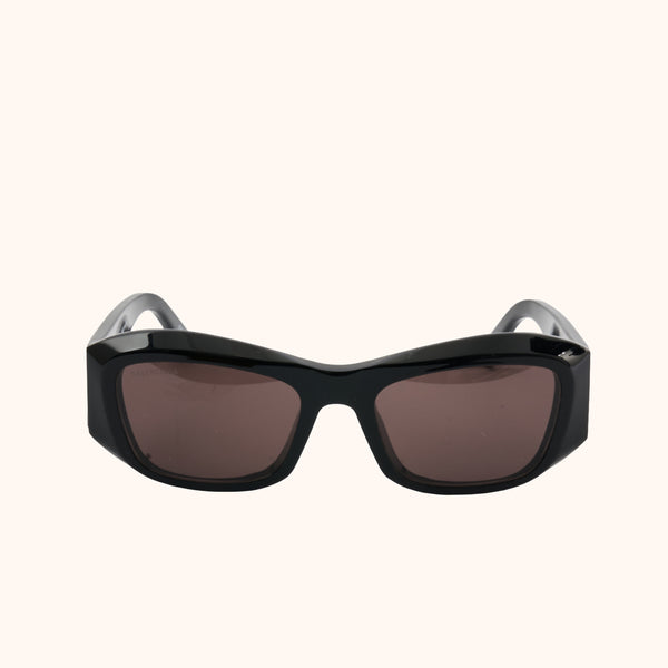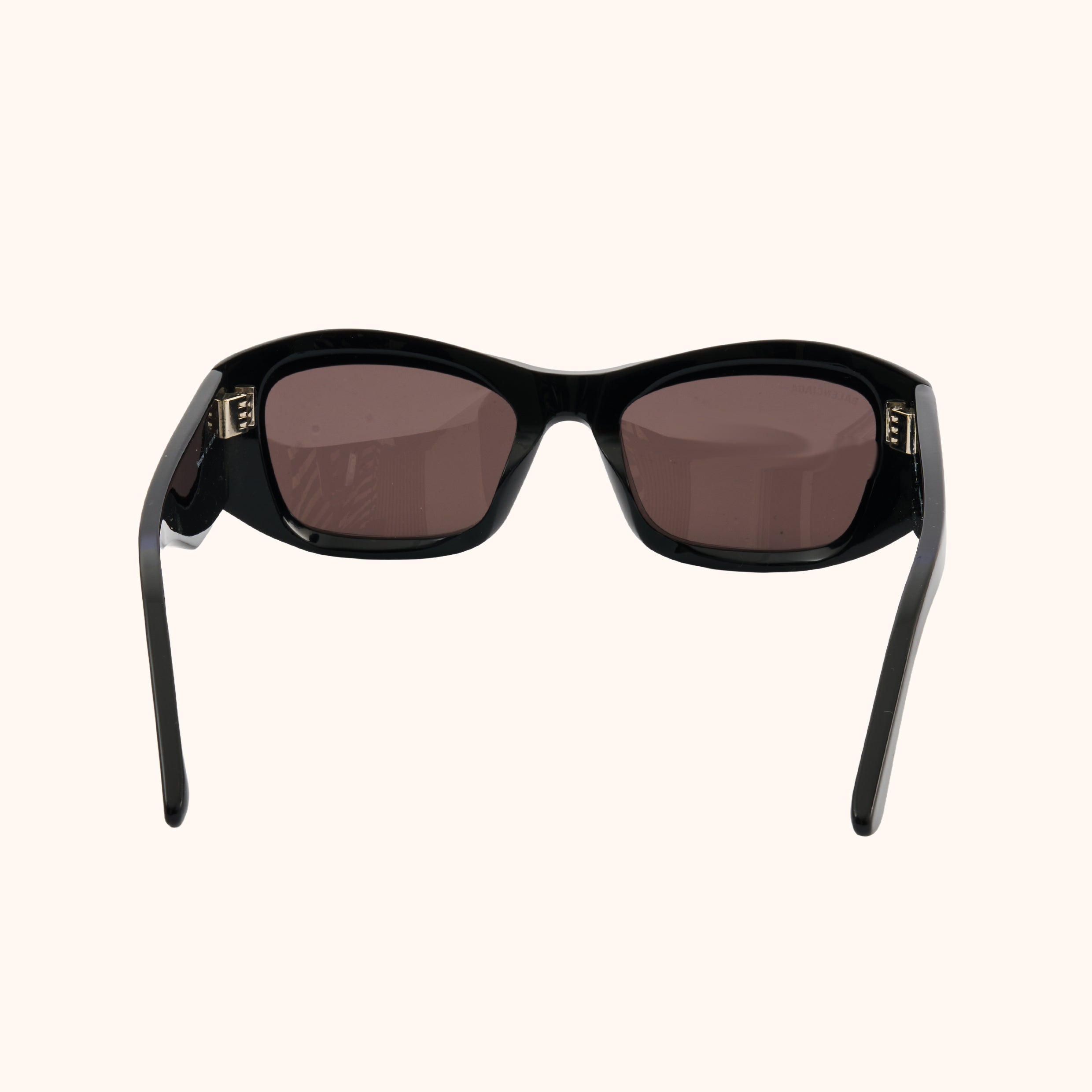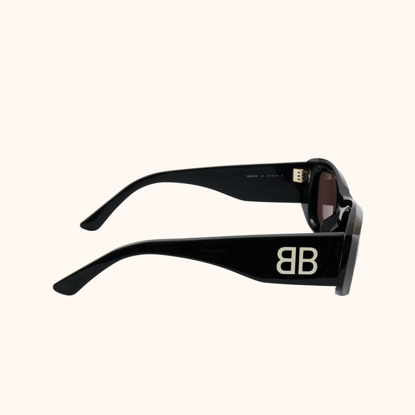Diese Sonnenbrille von Balenciaga setzt auf kontrastreiche Klarheit: Ein tiefschwarzer Rahmen trifft auf das ikonische, weiß gedruckte „B“ am Bügel – ein grafisches Statement, das sofort ins Auge fällt. Die kantige Form und das reduzierte Design verleihen der Brille eine selbstbewusste Coolness, wie man sie von Balenciaga erwartet.