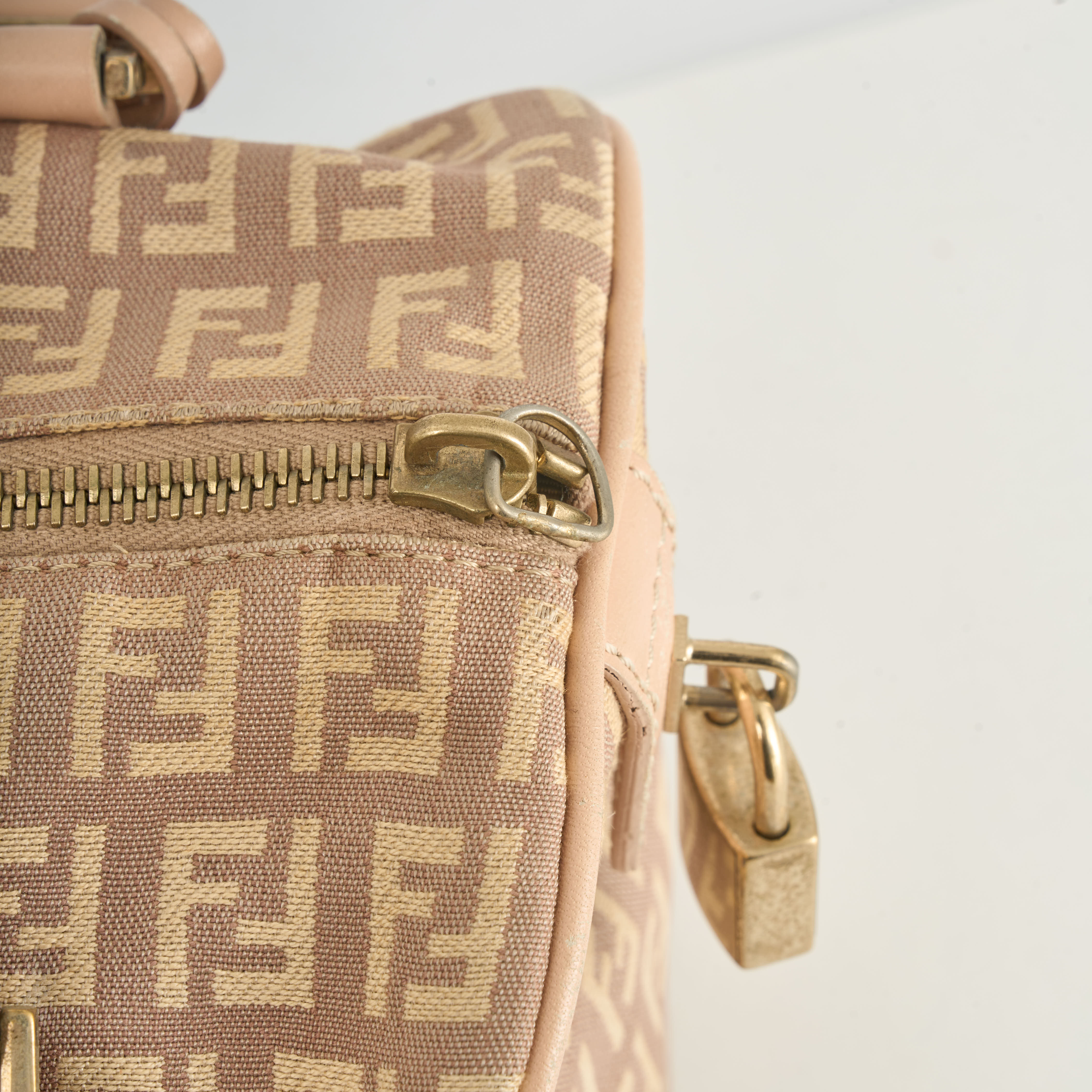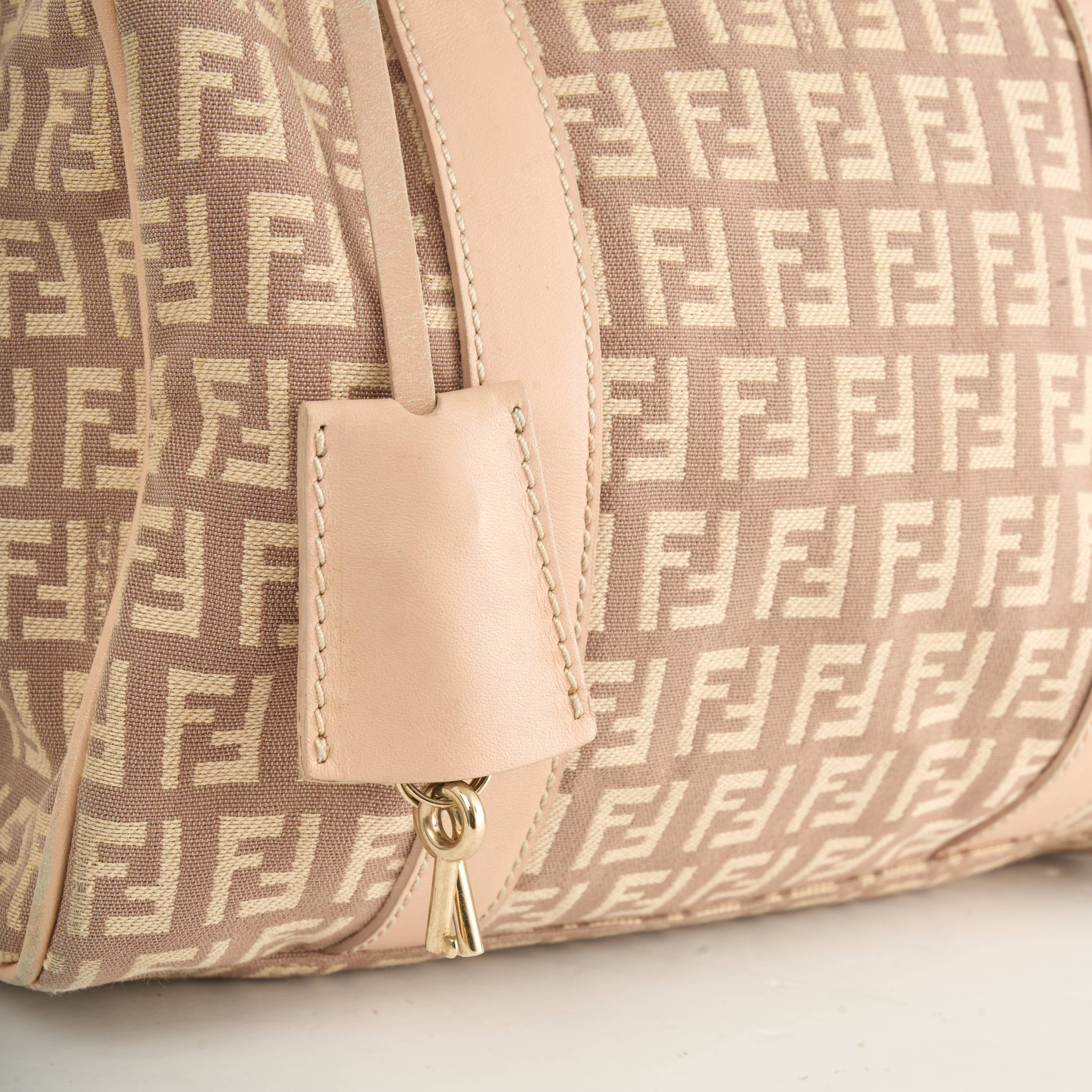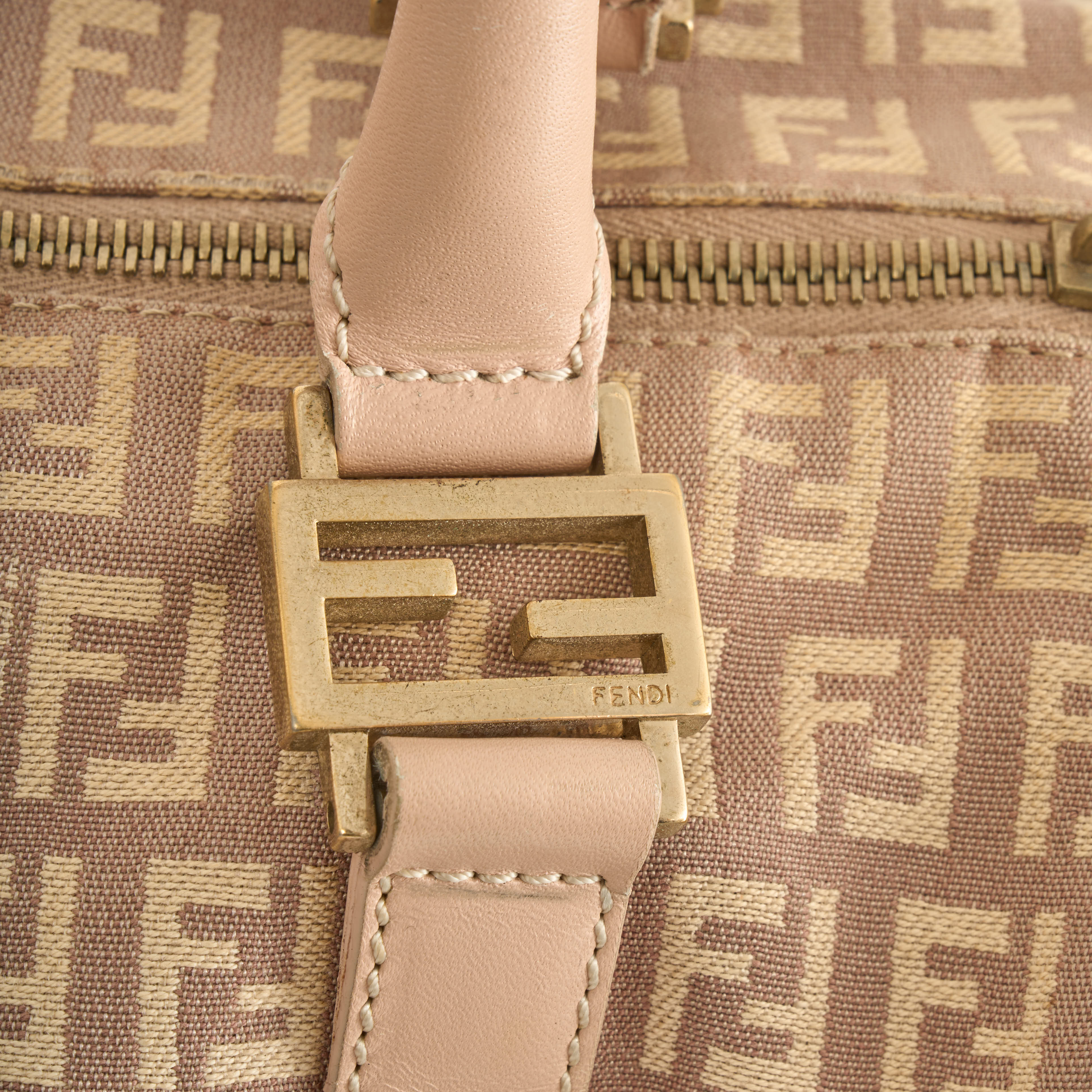 Diese Fendi Boston Bag im klassischen Zucchino-Monogramm ist eine elegante Begleiterin für den Alltag. Der zarte Rosaton kombiniert mit beigem FF-Canvas ergibt eine harmonische, feminine Optik. Die Tasche punktet durch ihre strukturierte Form, ihre goldfarbene Hardware sowie charmante Details wie das kleine Fendi-Vorhängeschloss samt Schlüssel in Lederhülle.