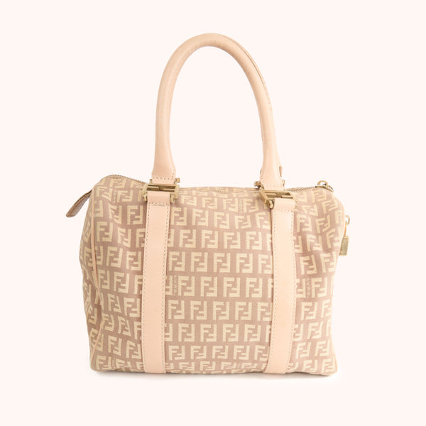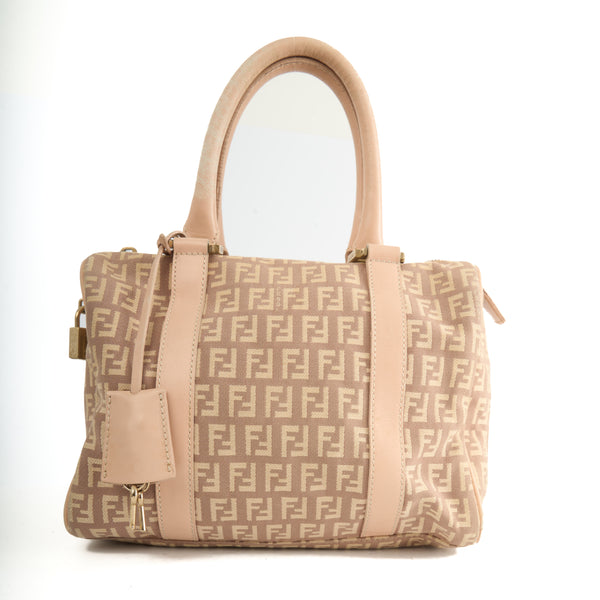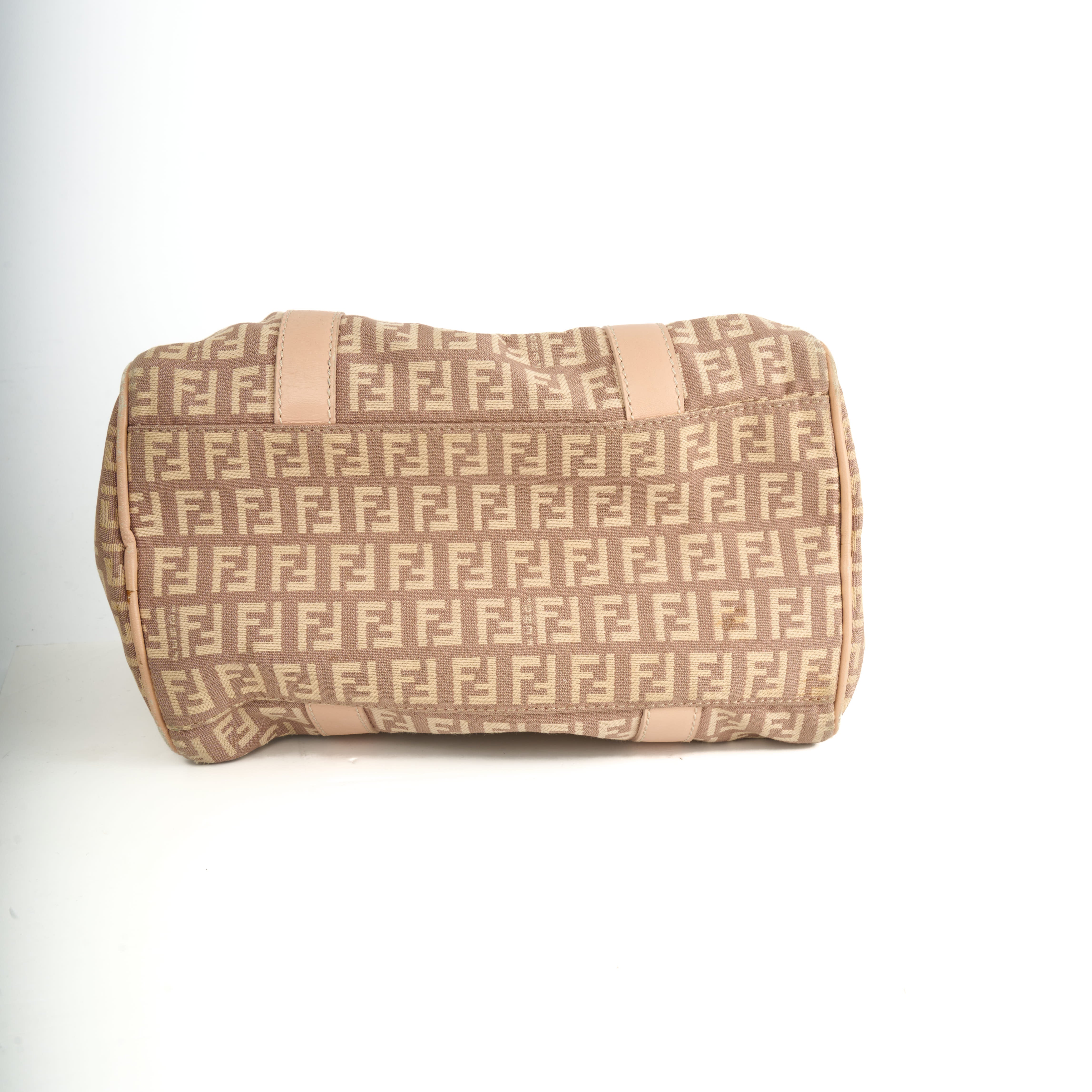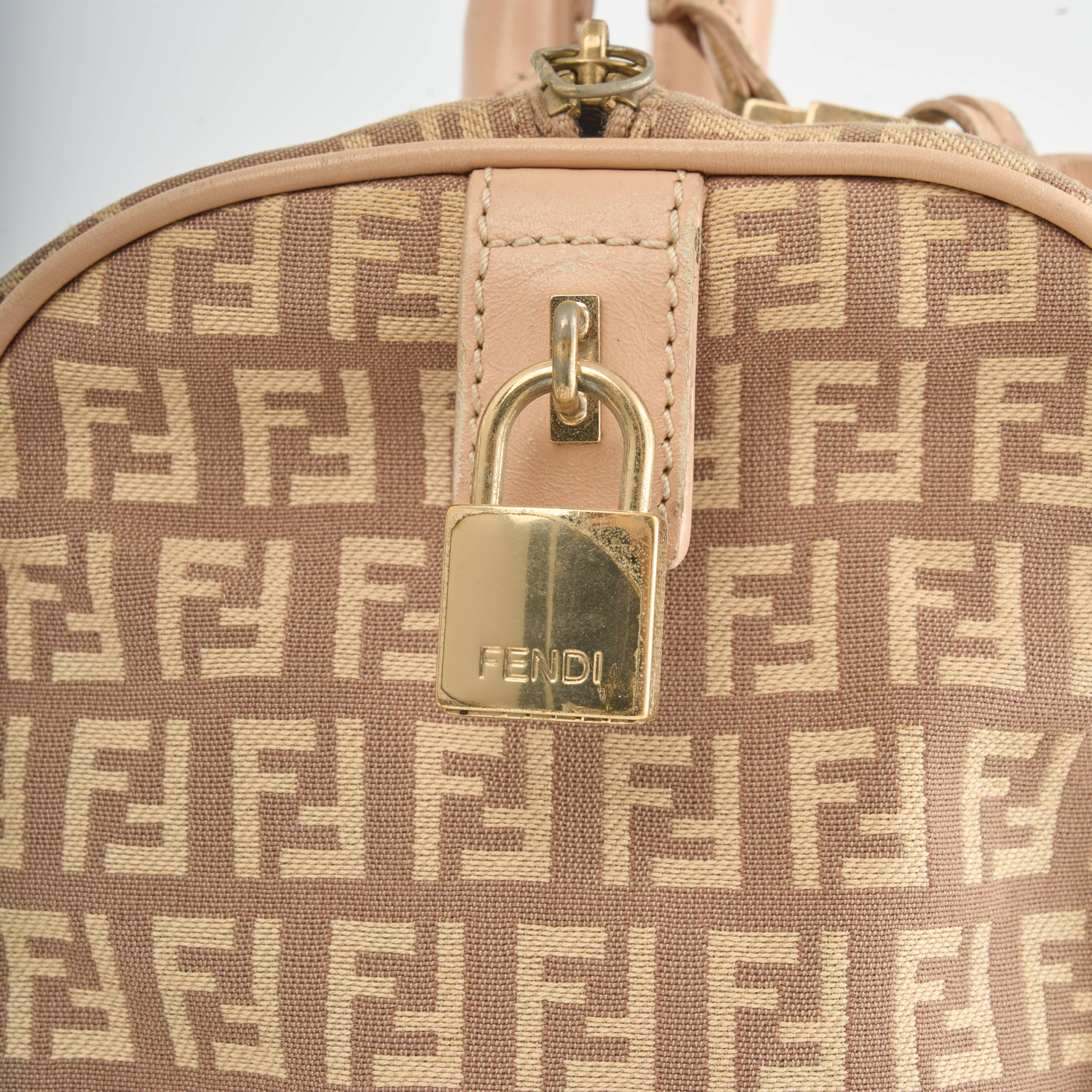 Diese Fendi Boston Bag im klassischen Zucchino-Monogramm ist eine elegante Begleiterin für den Alltag. Der zarte Rosaton kombiniert mit beigem FF-Canvas ergibt eine harmonische, feminine Optik. Die Tasche punktet durch ihre strukturierte Form, ihre goldfarbene Hardware sowie charmante Details wie das kleine Fendi-Vorhängeschloss samt Schlüssel in Lederhülle.