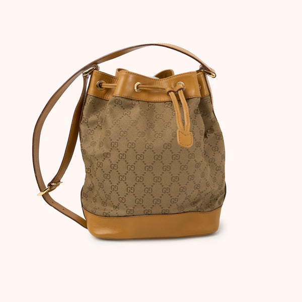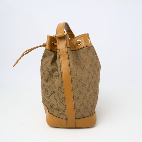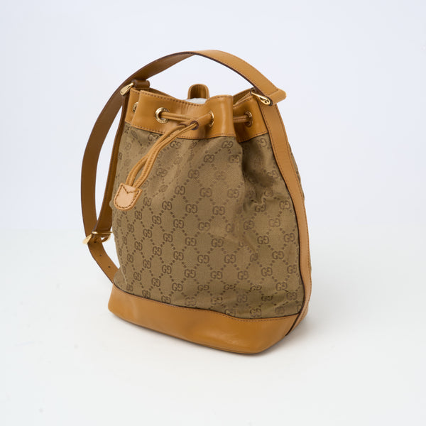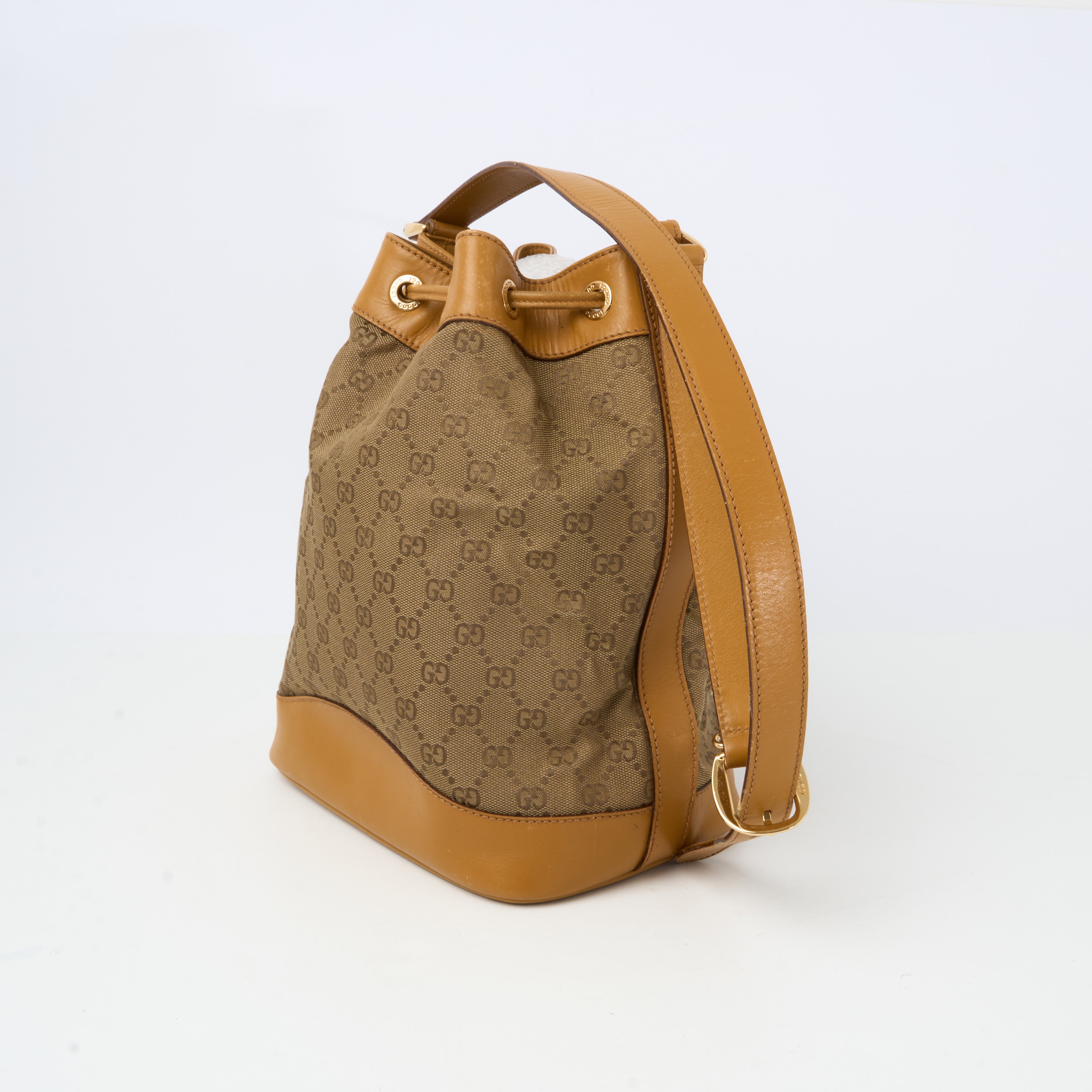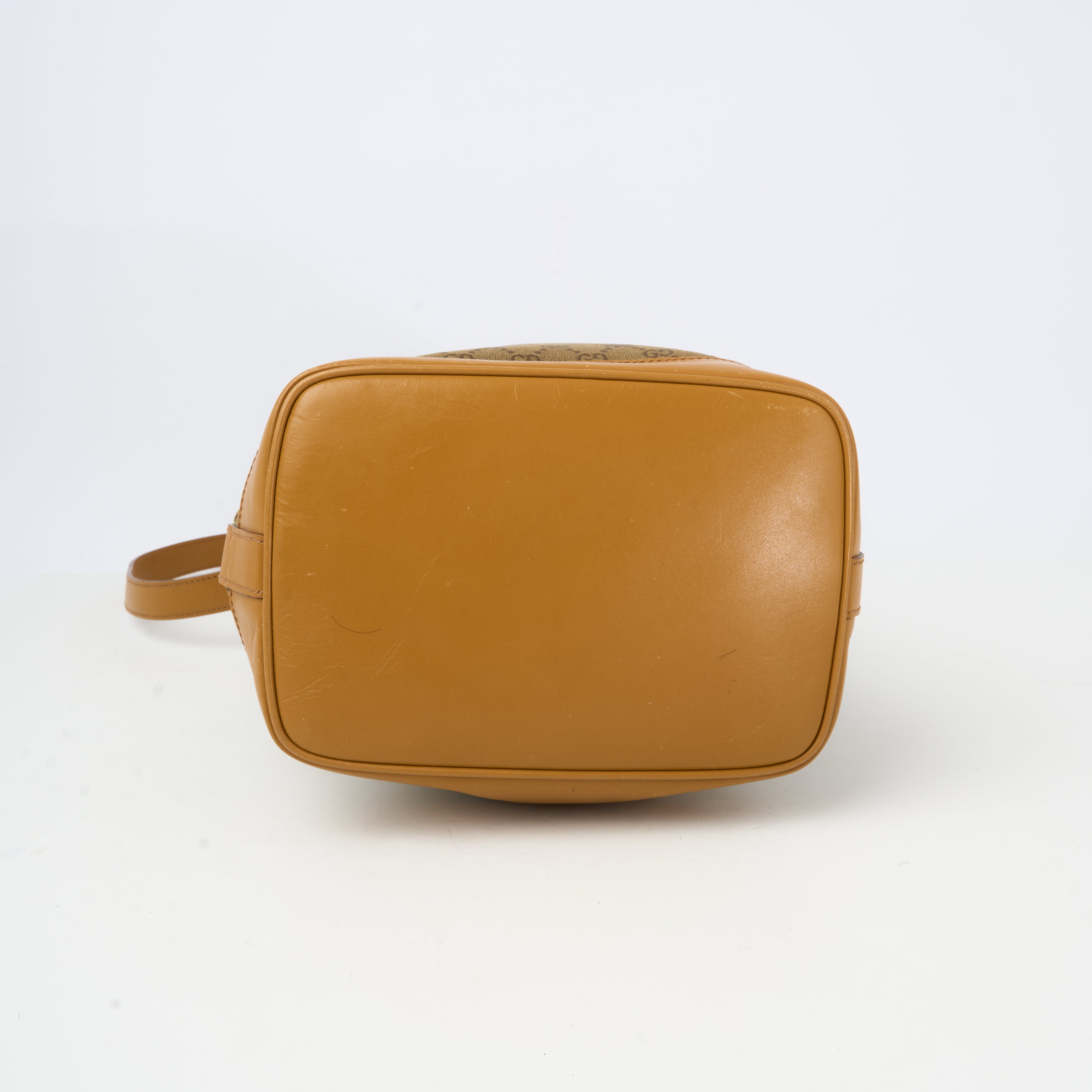 GutDiese klassische Bucket Bag von Gucci ist ein eleganter Begleiter aus der Vintage-Ära des Hauses. Gefertigt aus dem typischen GG Supreme Canvas in Kombination mit glänzendem cognacfarbenem Leder, vereint sie sportliche Lässigkeit mit luxuriösem Understatement.