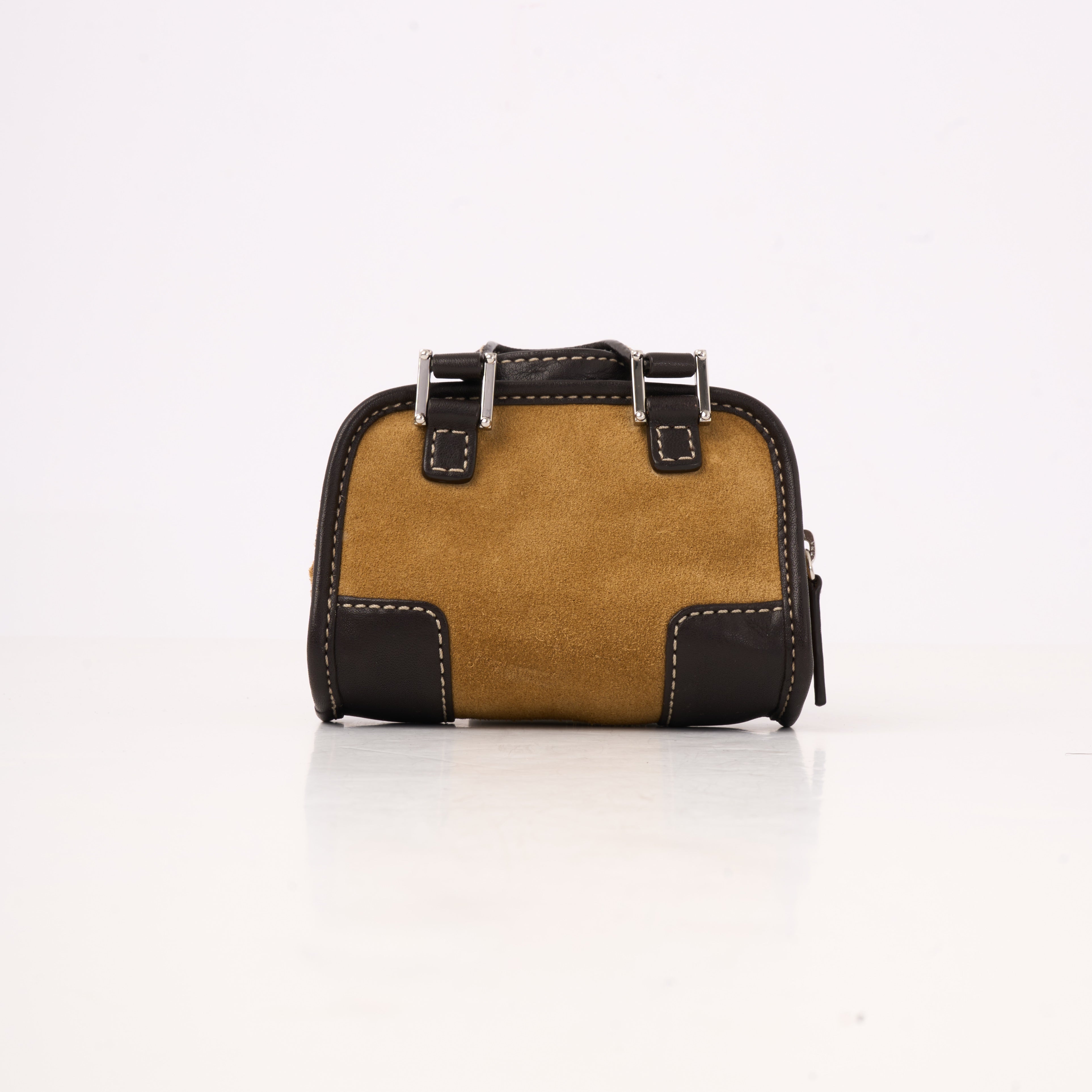 NagelneuDie Amazona Nano von Loewe ist eine Miniaturausgabe des ikonischen Amazona-Modells – kompakt, verspielt und dennoch luxuriös verarbeitet. Gefertigt aus honigfarbenem Wildleder mit dunkelbraunen Glattlederbesätzen, punktet dieses Modell mit kontrastierenden Ziernähten und der geprägten Anagramm-Signatur auf der Vorderseite. Die silberfarbene Hardware rundet den Look modern und hochwertig ab.