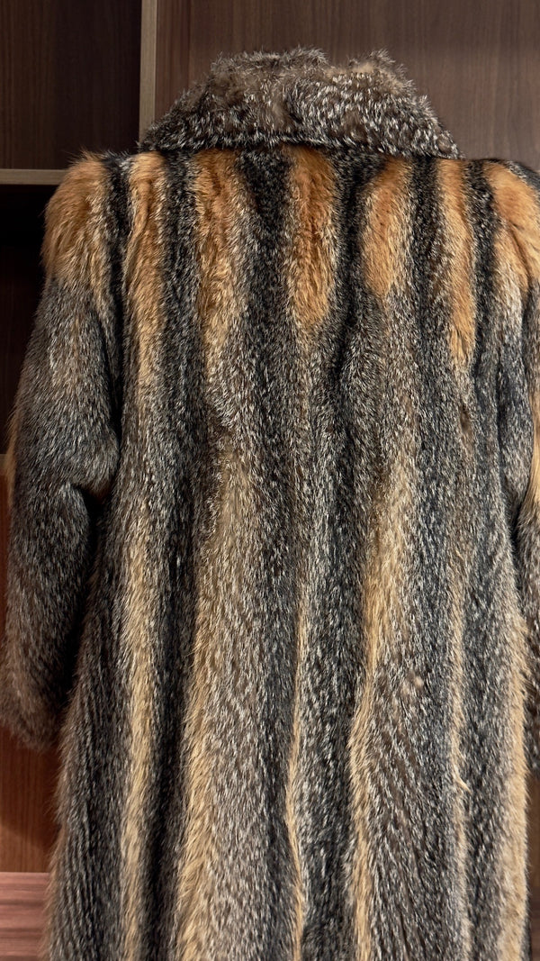 Dieser außergewöhnliche Mantel aus 100% echtem Griesfuchsfell beeindruckt mit seiner natürlichen, hellen Farbstruktur und der üppigen, voluminösen Felltextur – ein echtes Statement-Piece in hochwertiger Vintage-Qualität. Die dichte, vollgriffige Struktur sorgt für eine eindrucksvolle Wärmeleistung, während der großzügige Schnitt eine kraftvolle, verlängerte Silhouette schafft, die sowohl elegant als auch markant wirkt. Ein seltener, charakterstarker Mantel, der die natürliche Schönheit des Griesfuchses eindrucksvoll zur Geltung bringt.