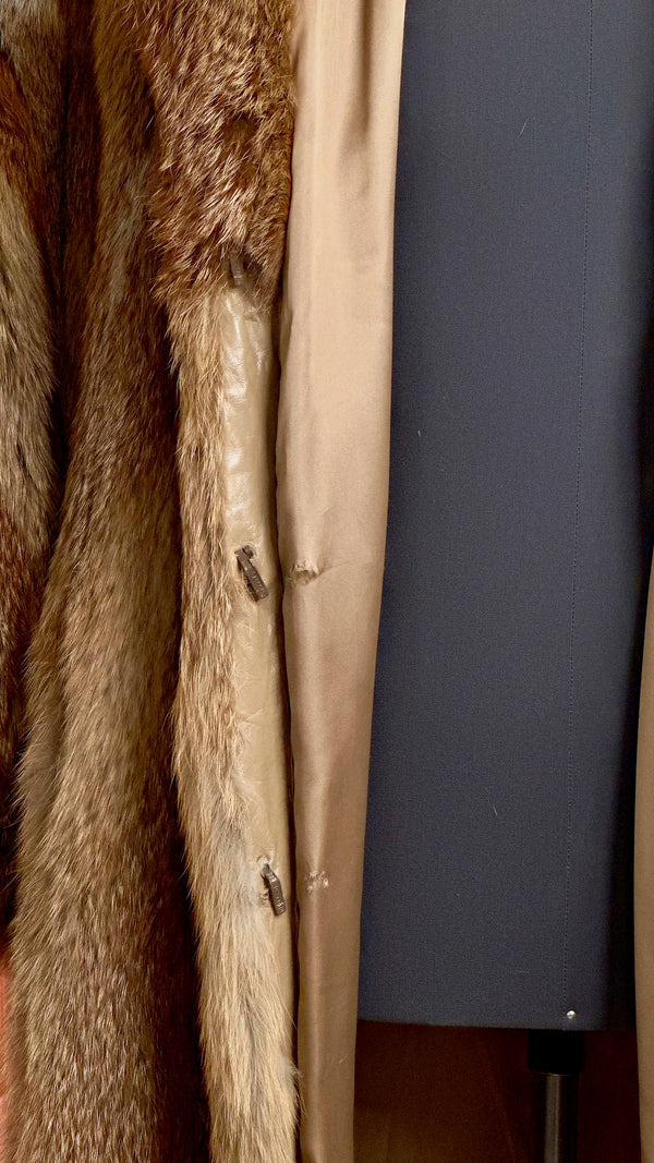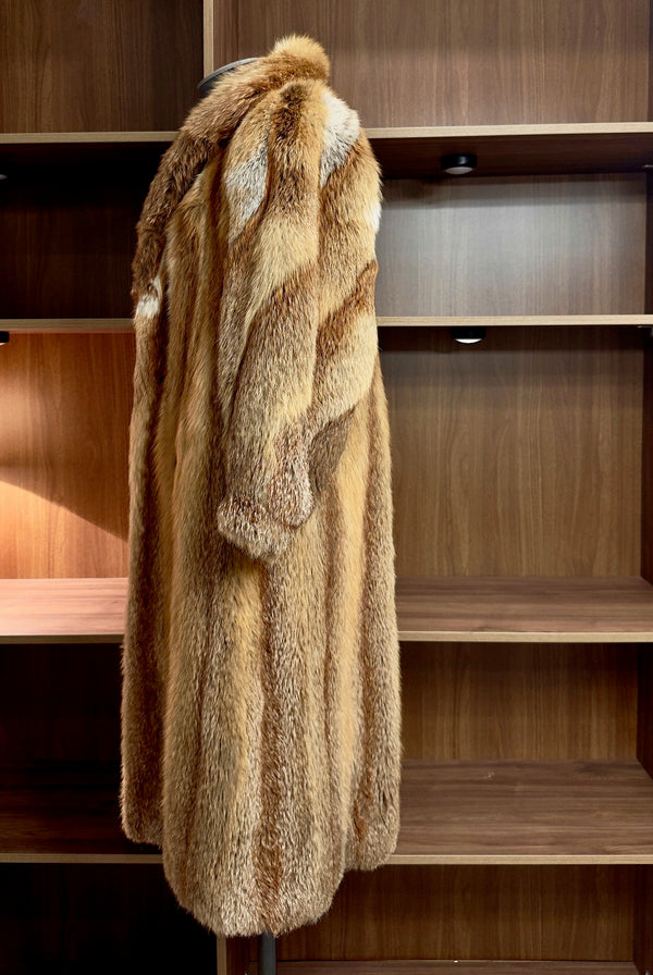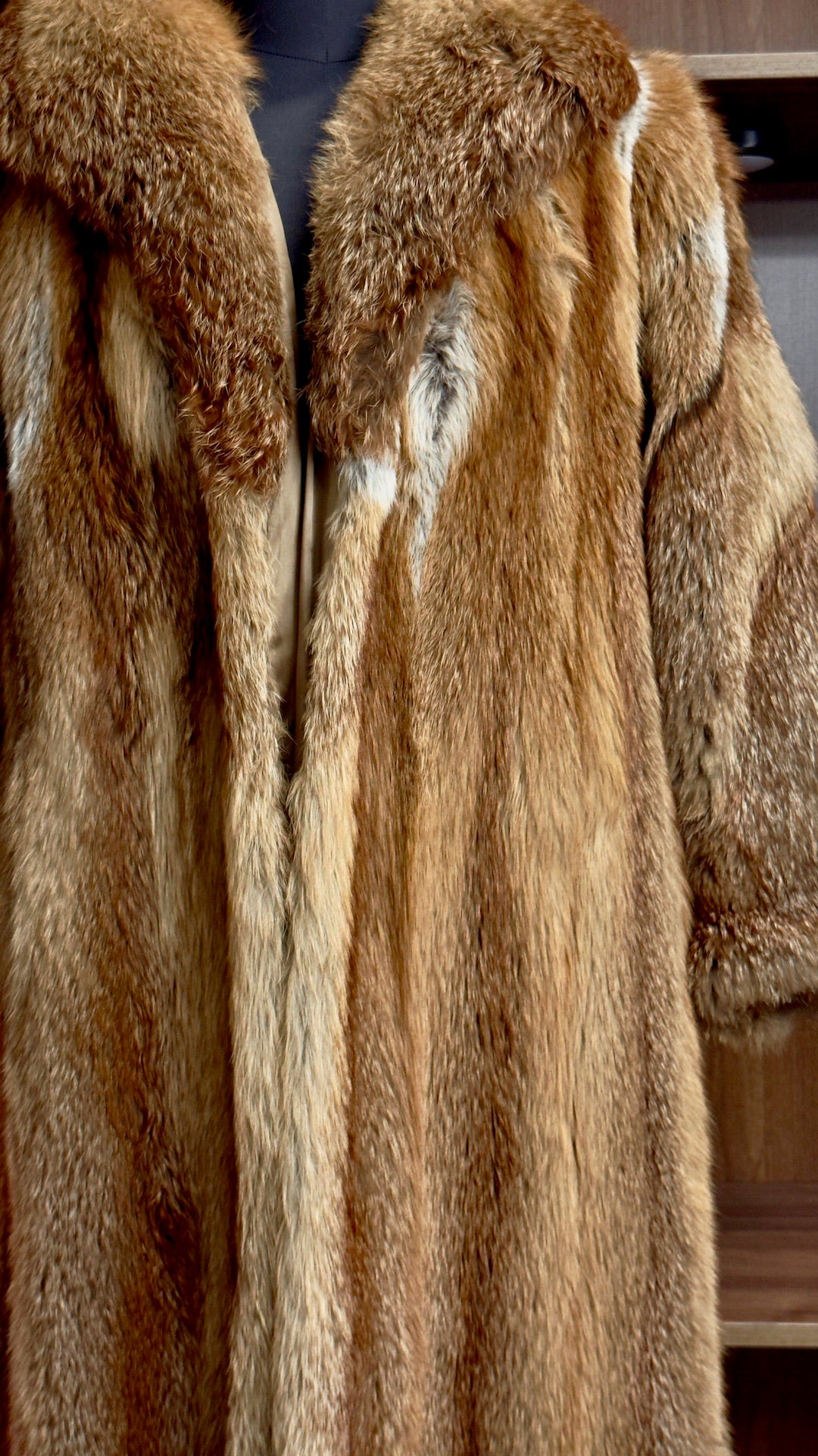 Dieser luxuriöse Mantel aus 100% echtem Rotfuchsfell präsentiert sich in einem warmen, natürlichen Rotton und verkörpert beeindruckende Fülle, Tiefe und elegante Vintage-Ästhetik. Die lange, weich fließende Silhouette sorgt für eine majestätische Ausstrahlung, während die natürliche Farbvariation des Rotfuchses dem Mantel eine lebendige, hochwertige Struktur verleiht. Ein echtes Statement-Piece, das klassische Winter-Eleganz mit authentischer, kraftvoller Präsenz verbindet – ideal für Liebhaberinnen hochwertiger, seltener Vintage-Pelze.