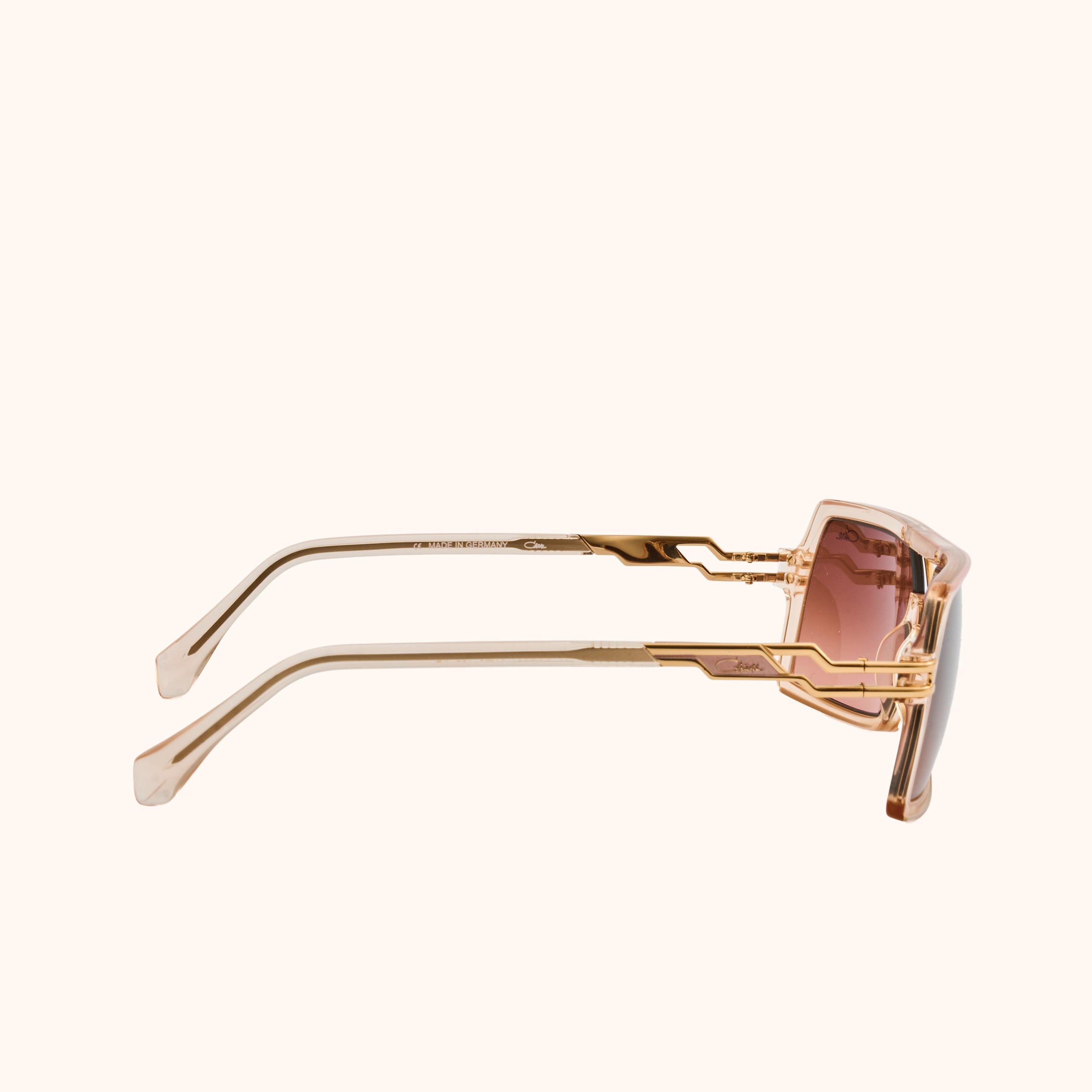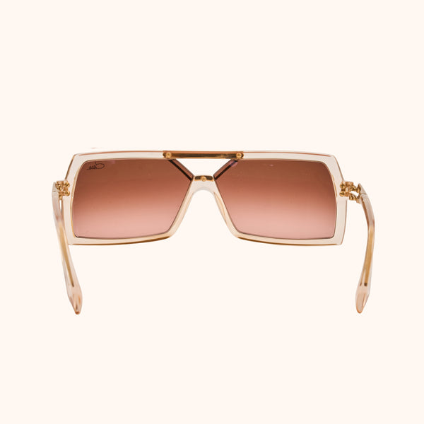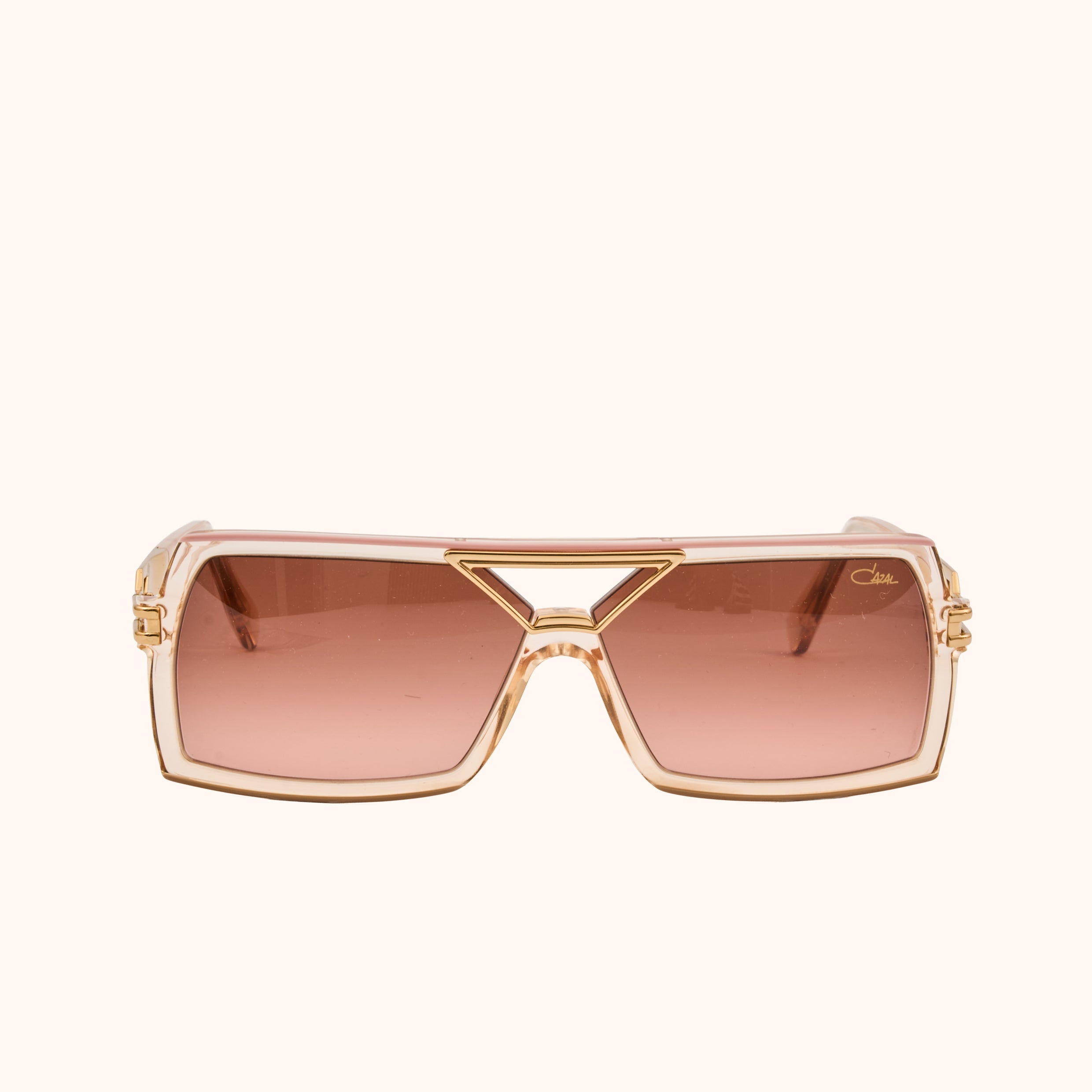 Diese Cazal Sonnenbrille vereint helle Braunnuancen mit goldfarbenen Elementen und sanften rosa-beigen Akzenten. Das Design spielt mit Transparenz, Wärme und einem Hauch Glamour – raffiniert, ohne aufdringlich zu sein. Der dezente Cazal-Schriftzug auf dem Glas rundet den Look als feines Signature-Detail ab.