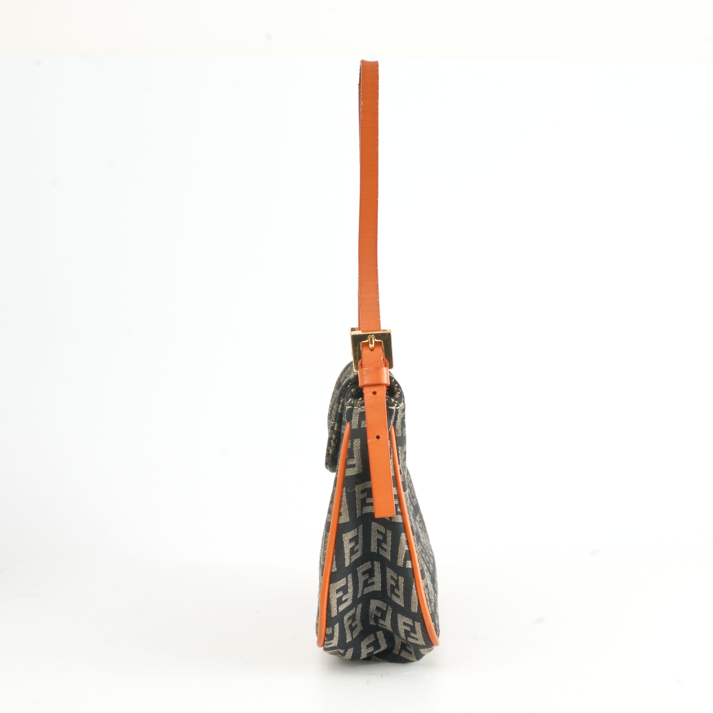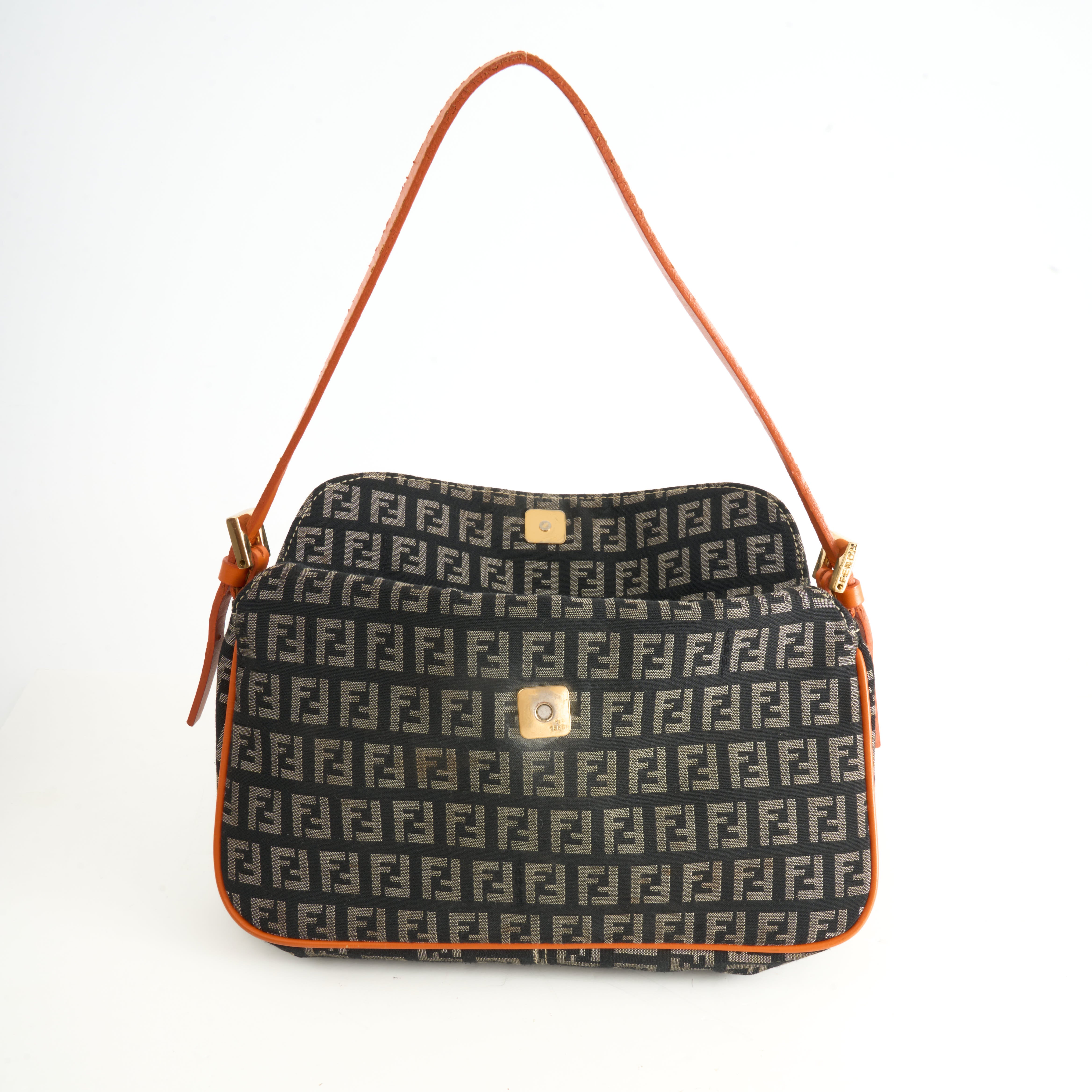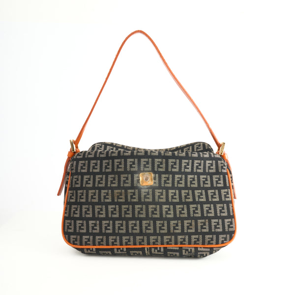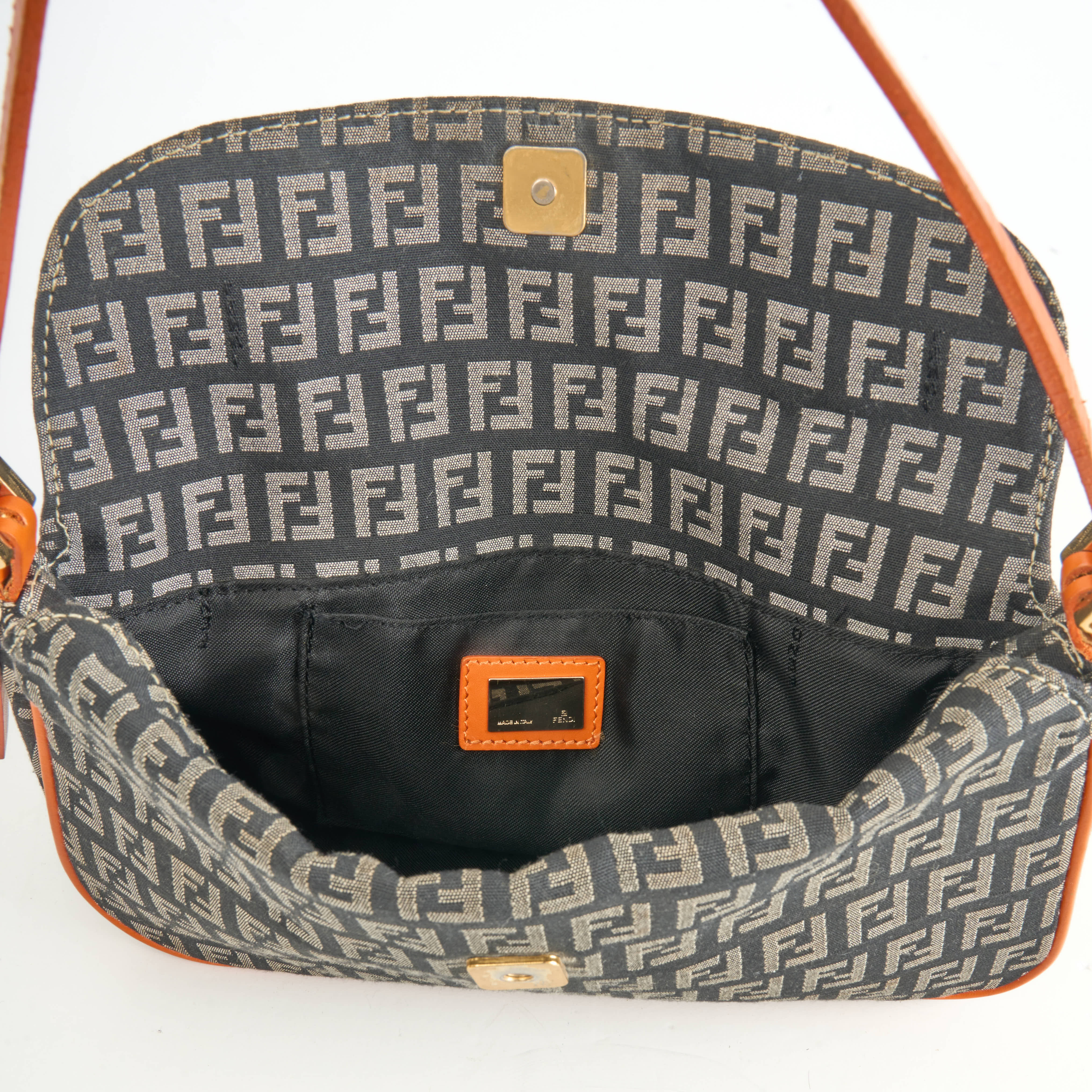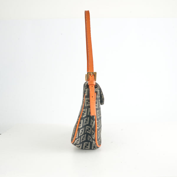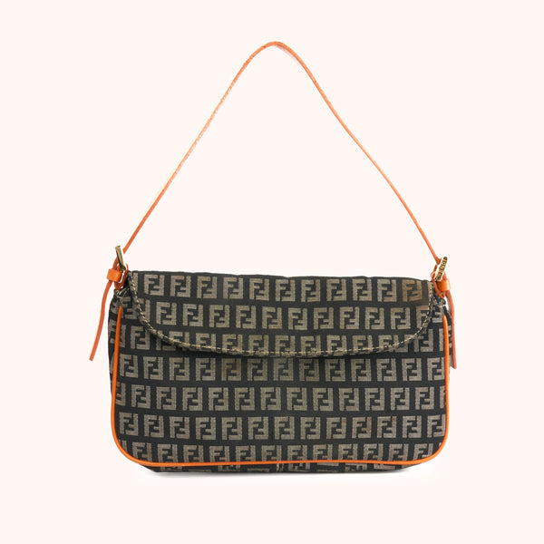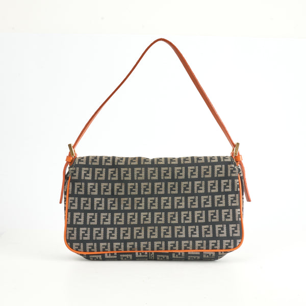 Diese Vintage Fendi Baguette Bag im klassischen Zucchino-Canvas mit FF-Monogramm ist ein ikonisches Modell, das Modegeschichte geschrieben hat. Die Kombination aus braunem Canvas mit knalligem Orange in Lederbesatz und Schulterriemen verleiht der Tasche einen frischen und zugleich nostalgischen Look.
