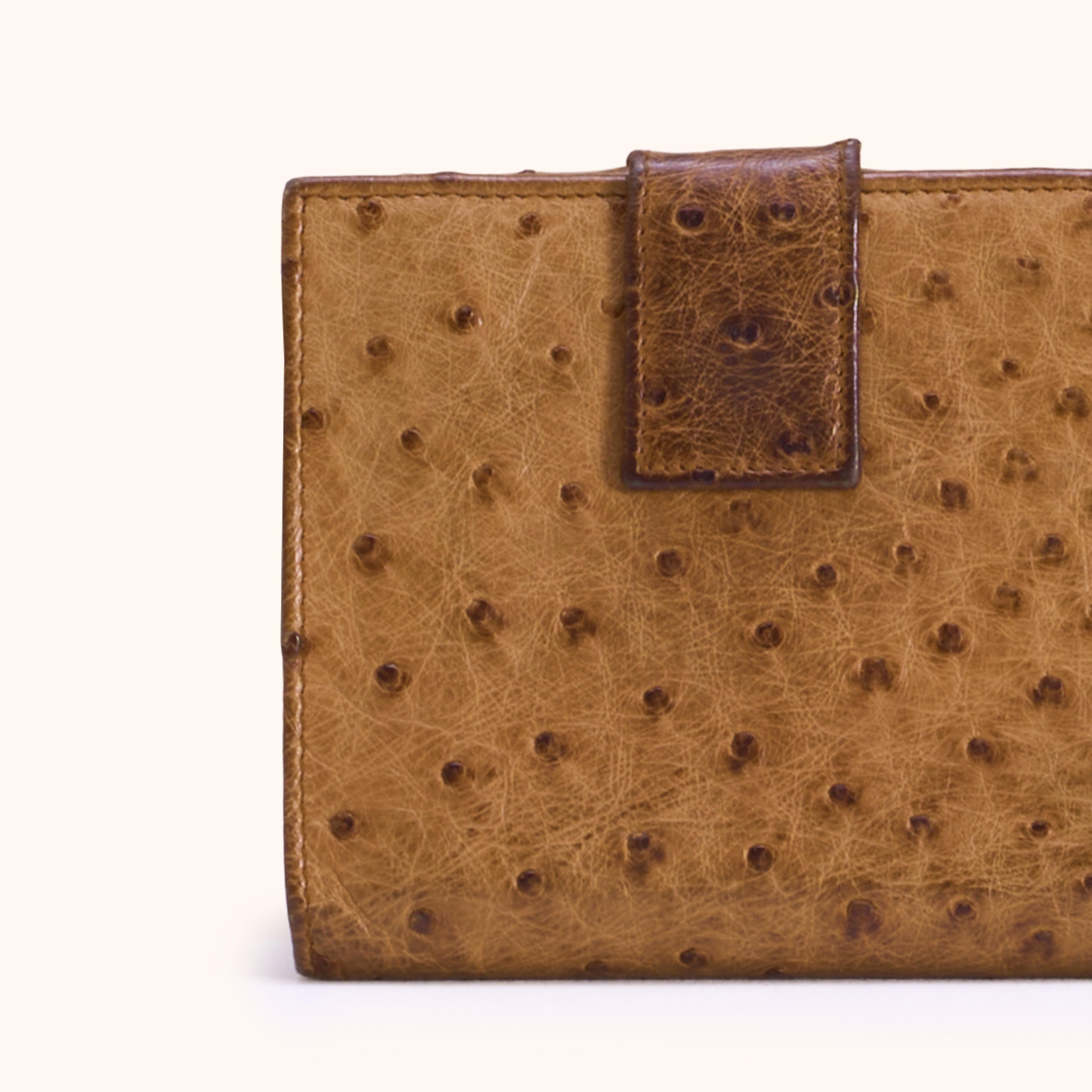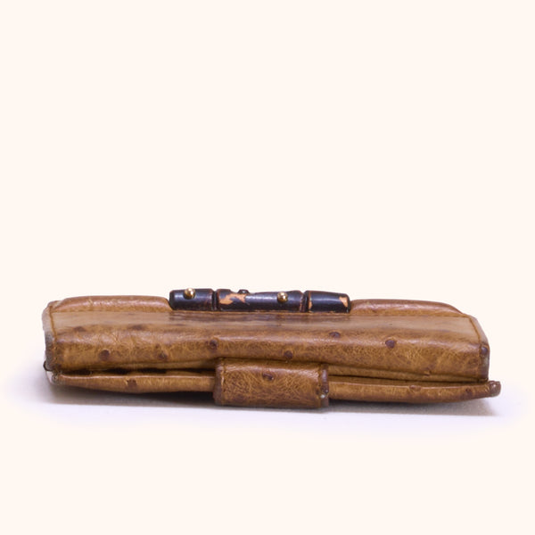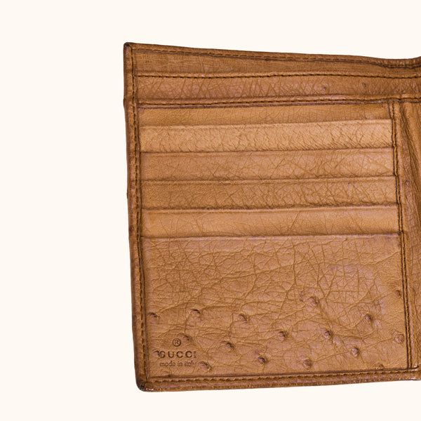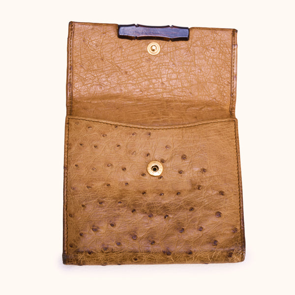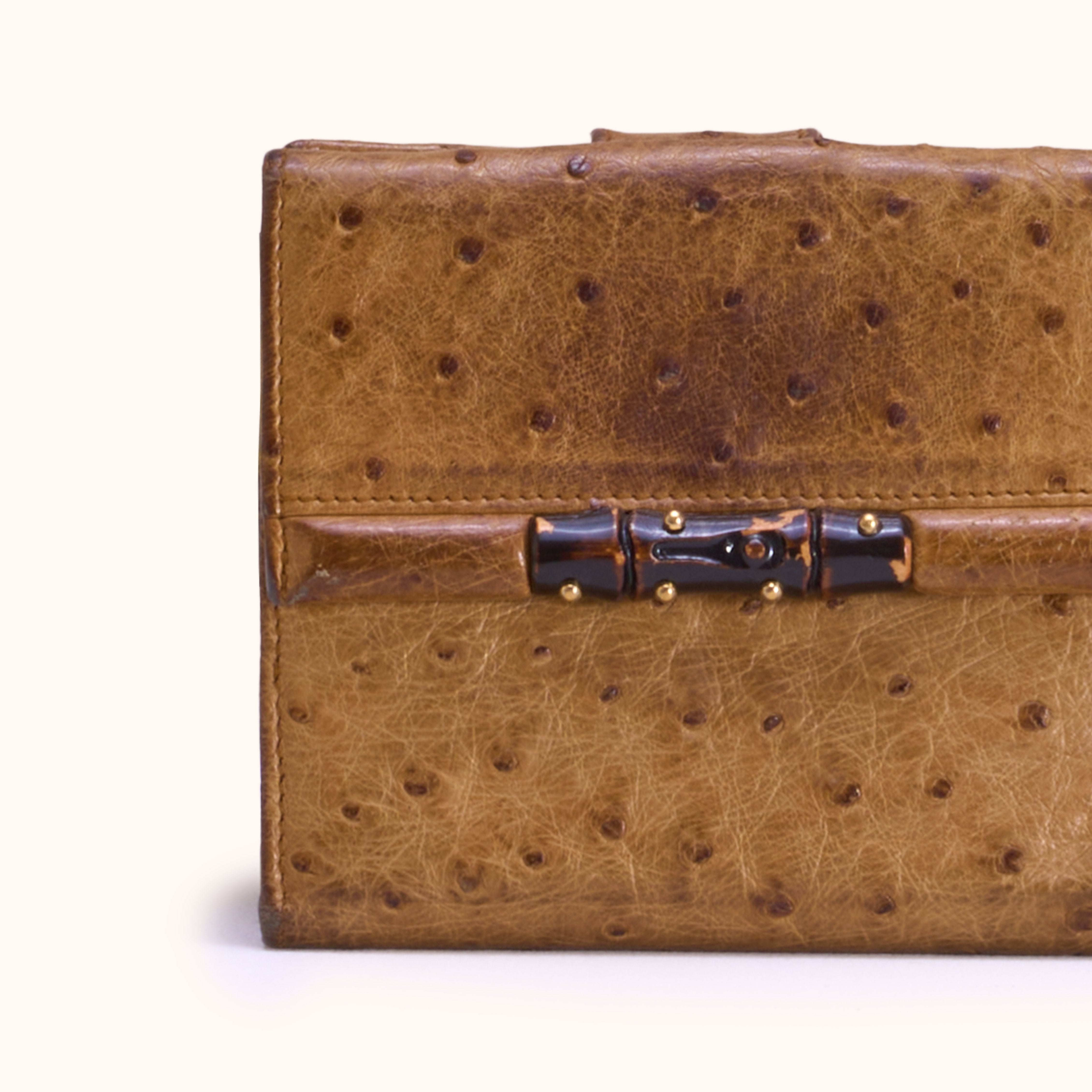 Diese exklusive Gucci Geldbörse aus echtem Straußenleder in warmem Braun vereint luxuriöses Material mit dem ikonischen Bamboo-Verschluss der Marke. Das natürliche Strukturmuster des Straußenleders und das charakteristische Bambus-Detail machen diese Vintage Wallet zu einem besonderen Sammlerstück.